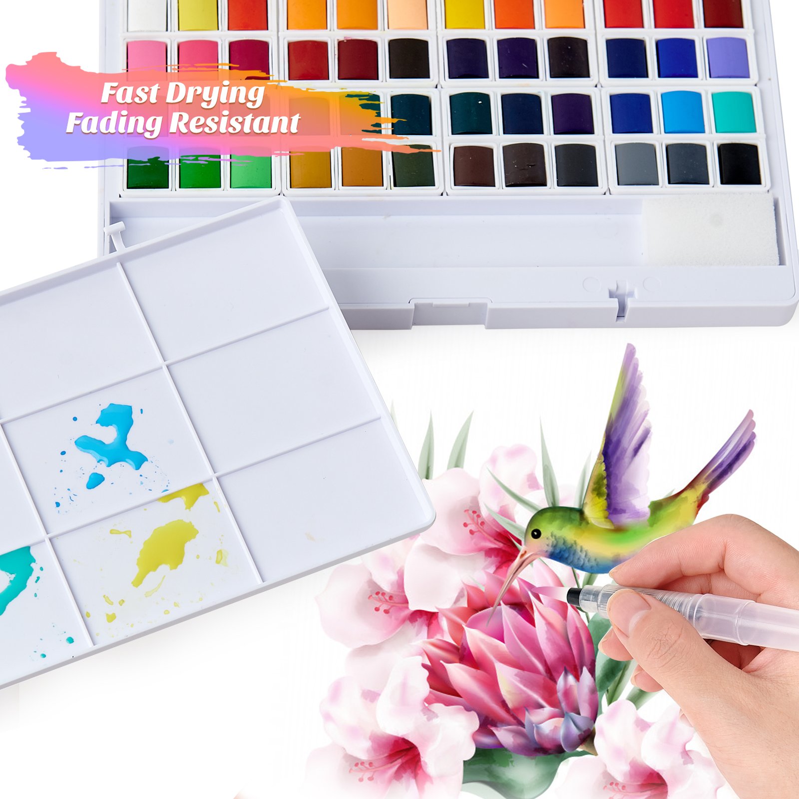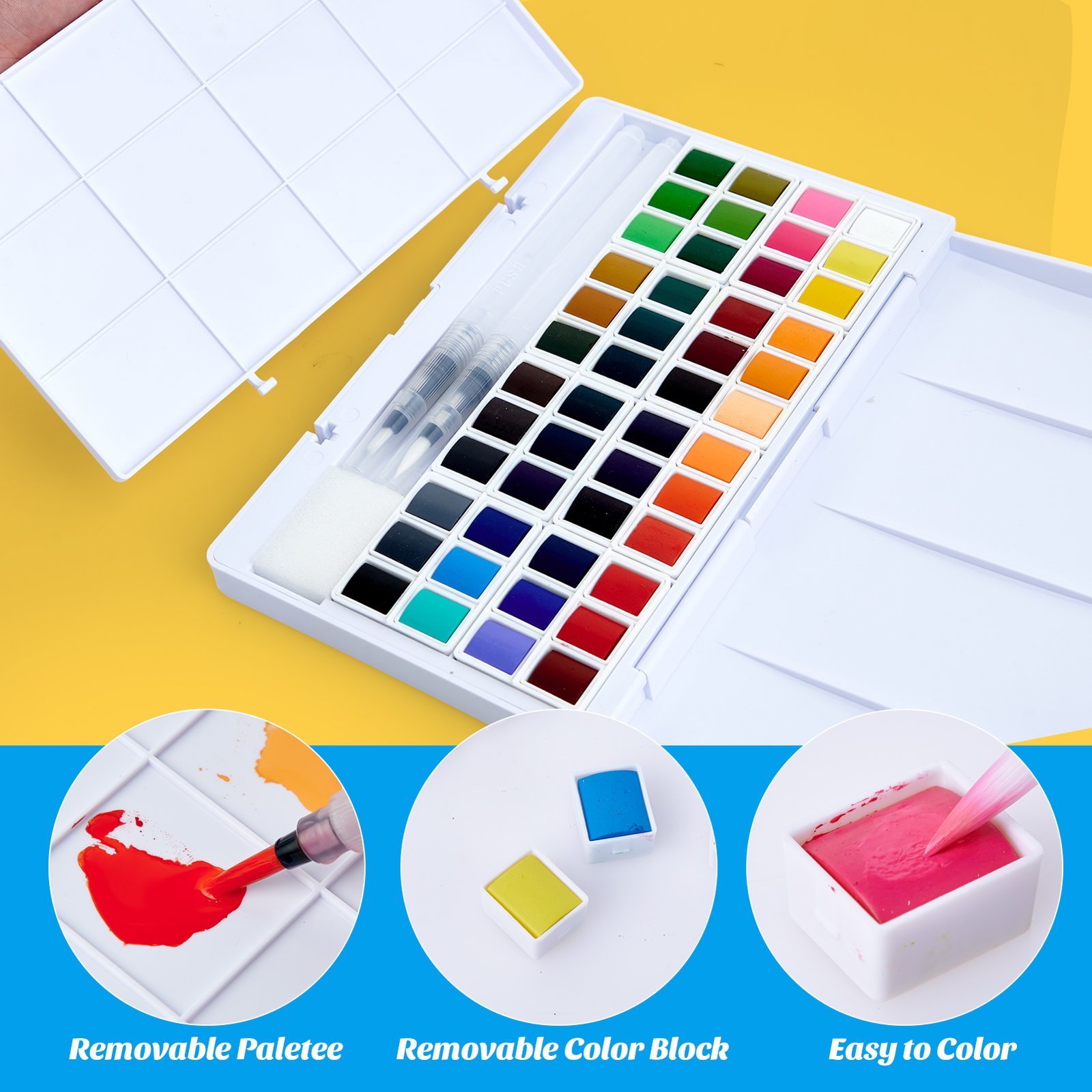 - [REMOVABLE COLOR BLOCK]: Each small color block in the watercolor set can be removed separately, which can effectively avoid dyeing between different colors. After the color block is used up, refills are available, making it a sustainable investment for long-term use.